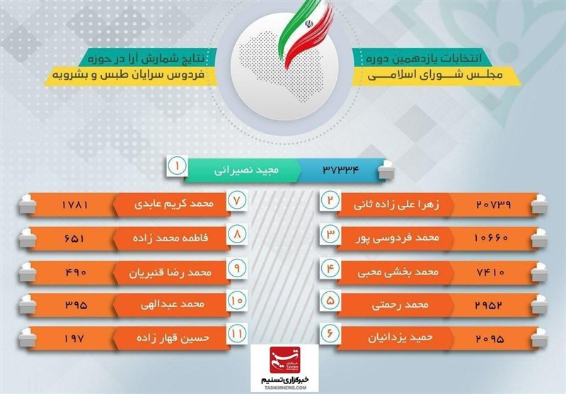 آرای بقیه نامزدهای انتخابات یازدهمین دوره مجلس شورای اسلامی در فردوس، سرایان، طبس و بشرویه به شرح ذیل است.