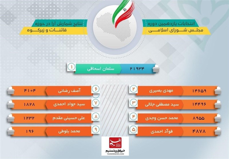 فرماندار قاین  اظهار داشت: با شمارش آرا در این حوزه انتخابیه سلمان اسحاقی با 31 هزار و 934 به عنوان نماینده منتخب مردم قاینات و زیرکوه در مجلس شورای اسلامی انتخاب شد.
