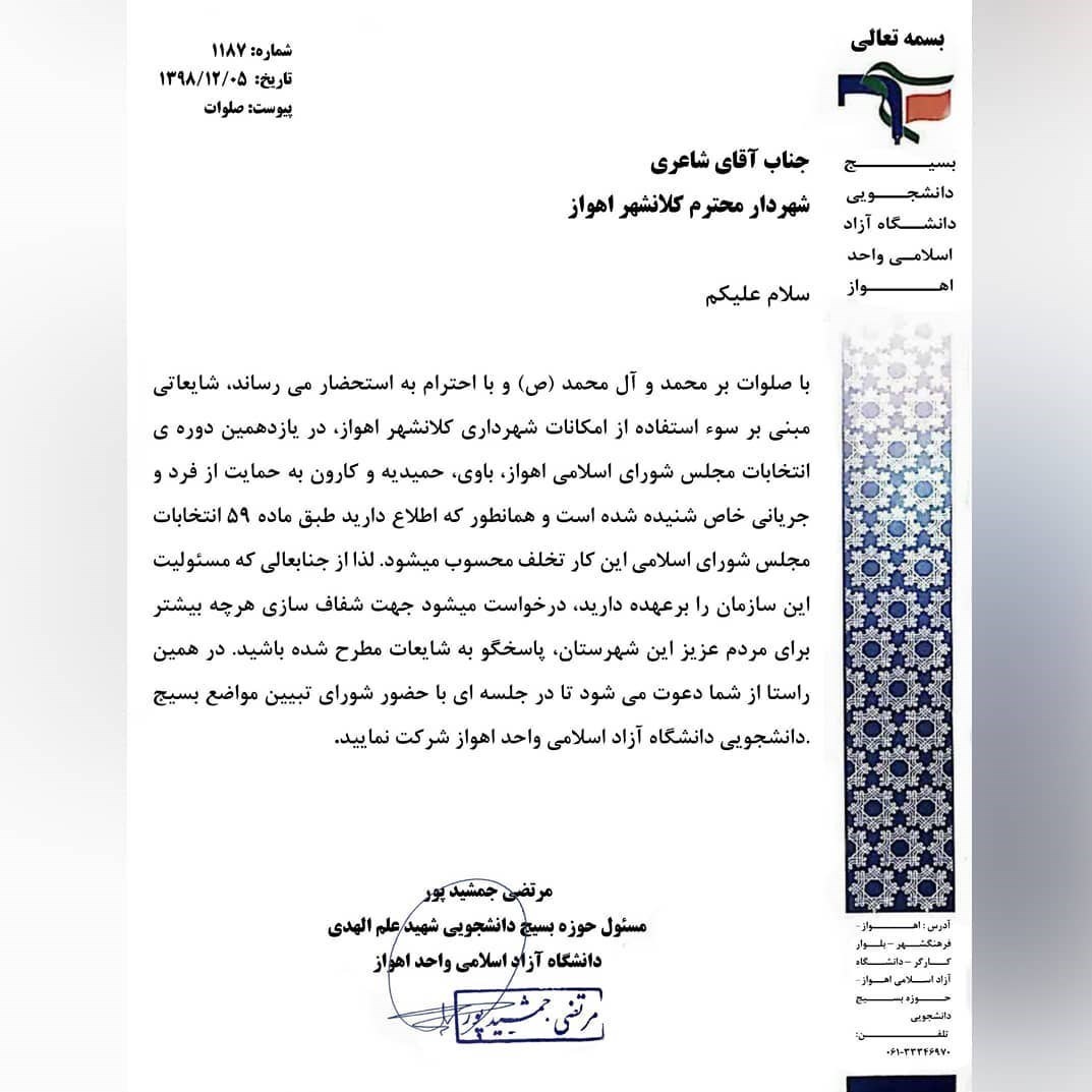 به گزارش خبرگزاری تسنیم از اهواز، دانشجویان بسیج دانشجویی دانشگاه آزاد اسلامی واحد اهواز در نامهای از شهردار اهواز تقاضا کردند تا نسبت به ادعاهای مطرح شده درباره دخالت شهردار اهواز و حمایت وی از برخی کاندیداها شفافسازی کند.