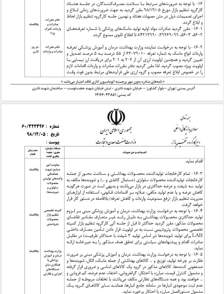 بر اساس مصوبات کارگروه تنظیم بازار، یکی از مصوبات در خصوص خطاب به دفتر مقررات صادرات و واردات گمرک صادرات مواد اولیه تولید ماسکهای پزشکی تا اطلاع ثانوی ممنوع شد. همچنین در مصوبه دیگری بر اساس درخواست نماینده وزیر بهداشت در کارگروه تنظیم بازار، تعرفه واردات انواع ماسک از ٥٥درصد به ٥درصد تعدیل یافت و اولویت ارزی آن از ٧-٢ به ١-٢ برای دریافت ارز نیمایی با اولویت ویژه به تصویب رسید.