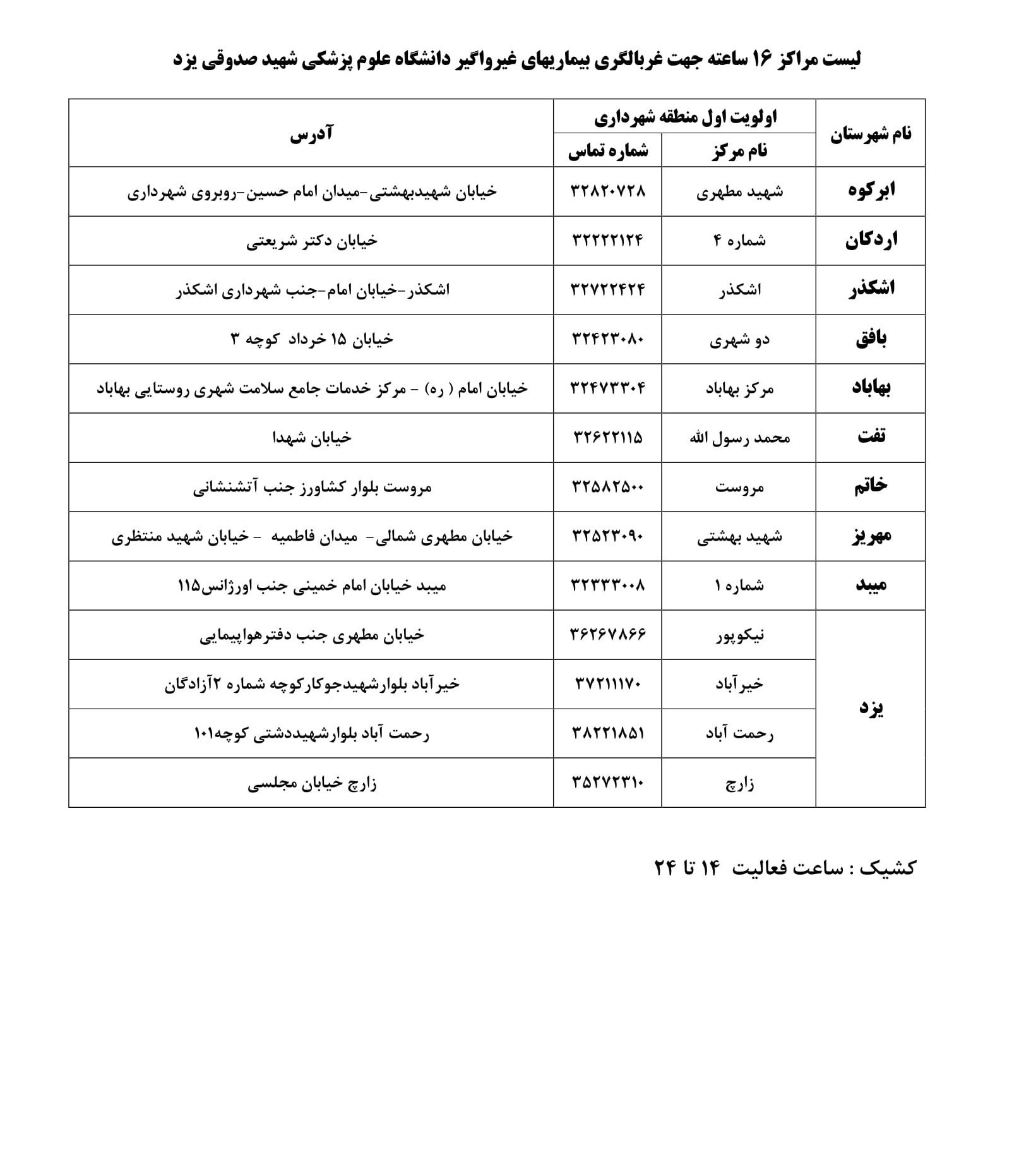 به گزارش خبرگزاری تسنیم از یزد، در راستای ارائه خدمات بهتر و بیشتر درمانی به شهروندان و برای پیشگیری و مقابله با ویروس کرونا، ساعات فعالیت مراکز منتخب در شهرستانهای استان یزد افزایش یافت.