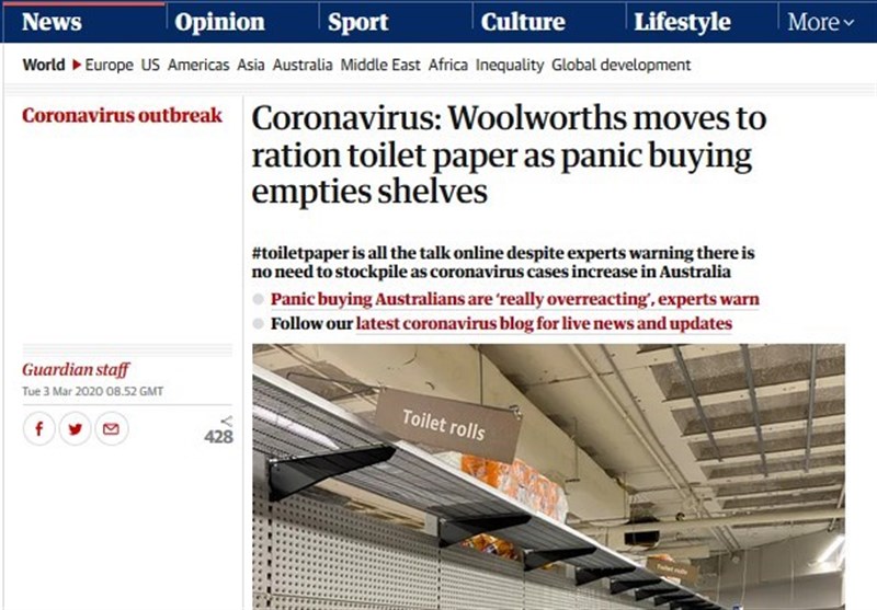 پایگاه خبری "گاردین" در گزارشی نوشت: به دنبال اعلان رسمی دولت استرالیا مبنی بر شناسایی 50 مبتلا به ویروس کرونا، دستمال توالت و مواد بهداشتی و شوینده در این کشور با کمبود روبه‌رو شد.