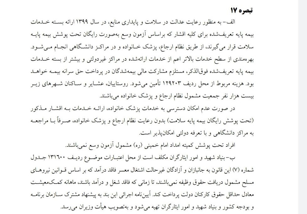 به گزارش خبرنگار اقتصادی خبرگزاری تسنیم، بر اساس تبصره 17 بودجه 1399 تسهیلات جدیدی به منظور رعایت عدالت در سلامت و پایداری منابع لحاظ شده است. بر مبنای این تبصره در سال 1399 ارائه بسته خدمات بیمه پایه تعریف شده برای کلیه اقشار که بر اساس آزمون وسع به صورت رایگان تحت پوشش بیمه پایه سلامت قرار میگیرند، از طریق نظام ارجاع، پزشک خانواده و در مراکز دانشگاهی انجام می‌شود.