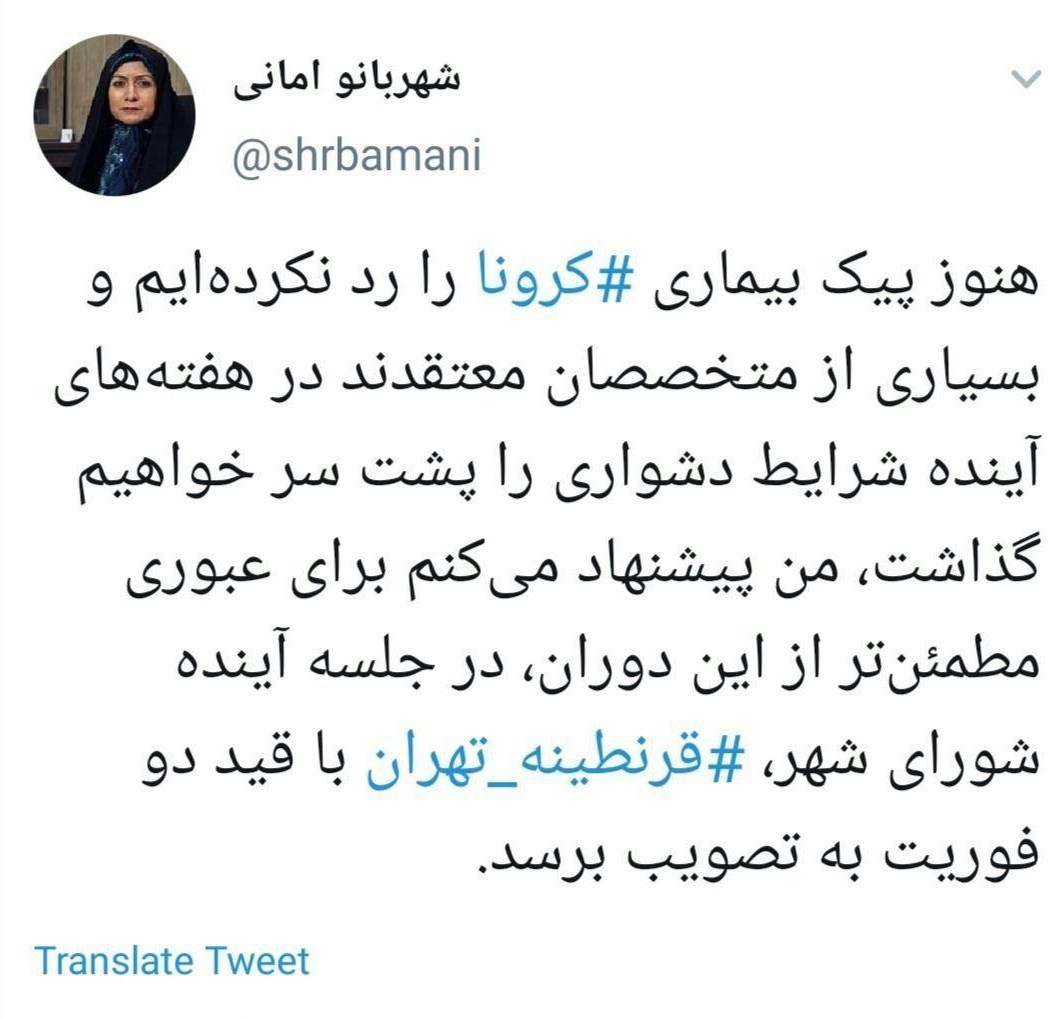 به گزارش خبرنگار اجتماعی خبرگزاری تسنیم, شهربانو امانی در صفحه شخصی خود نوشت: هنوز یک بیماری کرونا را رد نکرده‌ایم و بسیاری از متخصصان معتقدند در هفته‌های آینده شرایط دشواری را پشت سر خواهیم گذاشت، من پیشنهاد می کنم برای عبوری مطمئن‌تر از این دوران، در جلسه آینده شورای شهر، قرنطینه تهران با قید دو فوریت به تصویب برسد.