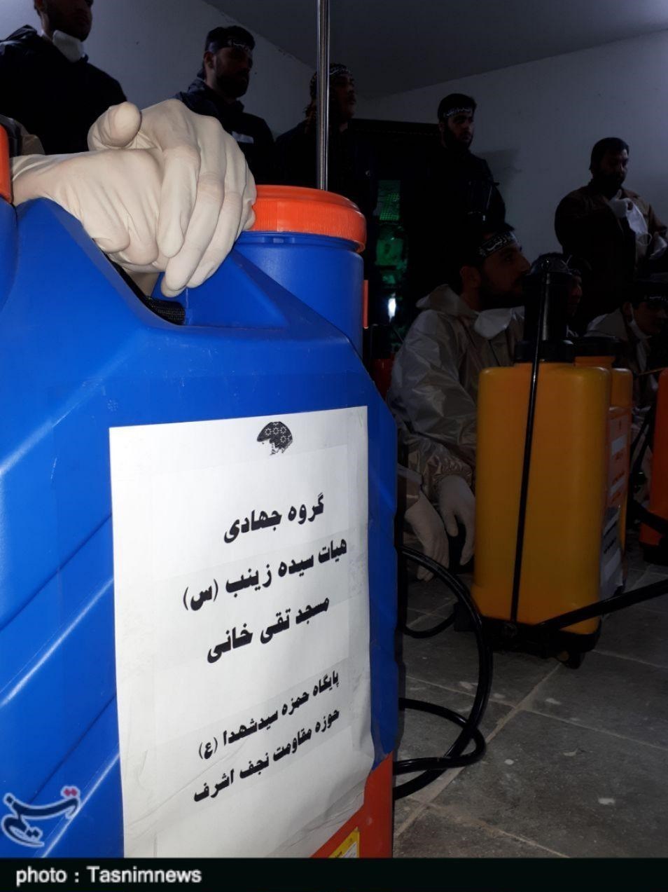 گروه جهادی هیئت سیده زینب(س) مسجد تقی خانی پایگاه حمزه سید الشهدا(ع) حوزه مقاومت نجف اشرف خرم‌آباد نیز این روزها که سلامتی مردم در خطر افتاده است پای کار آمده‌اند تا با ضدعفونی اماکن عمومی این خطر را از مردم دور کنند.