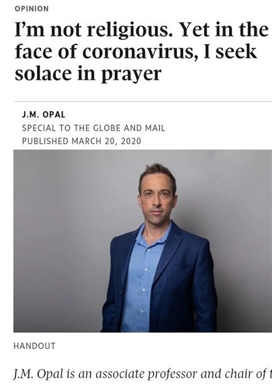 وی در این مقاله خود و خانوادهاش را افرادی بیدین معرفی میکند که صرفاً با قواعد اخلاقی زندگی خود را جهت میدهد، اما چالش کرونا سبب جلب توجه او به دین و ارزشهای دینی همچون دعا شده است.