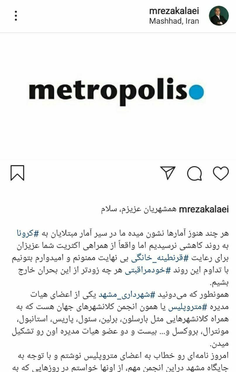 به گزارش خبرگزاری تسنیم از مشهدمقدس، محمدرضا کلایی؛ شهردار مشهدمقدس در پستی اینستاگرامی به نامه‌نگاری خود با انجمن کلانشهرهای جهان در مورد وضعیت این شهر و ضرورت اقدام عملی برای رفع تحریم‌ها خبر داد.