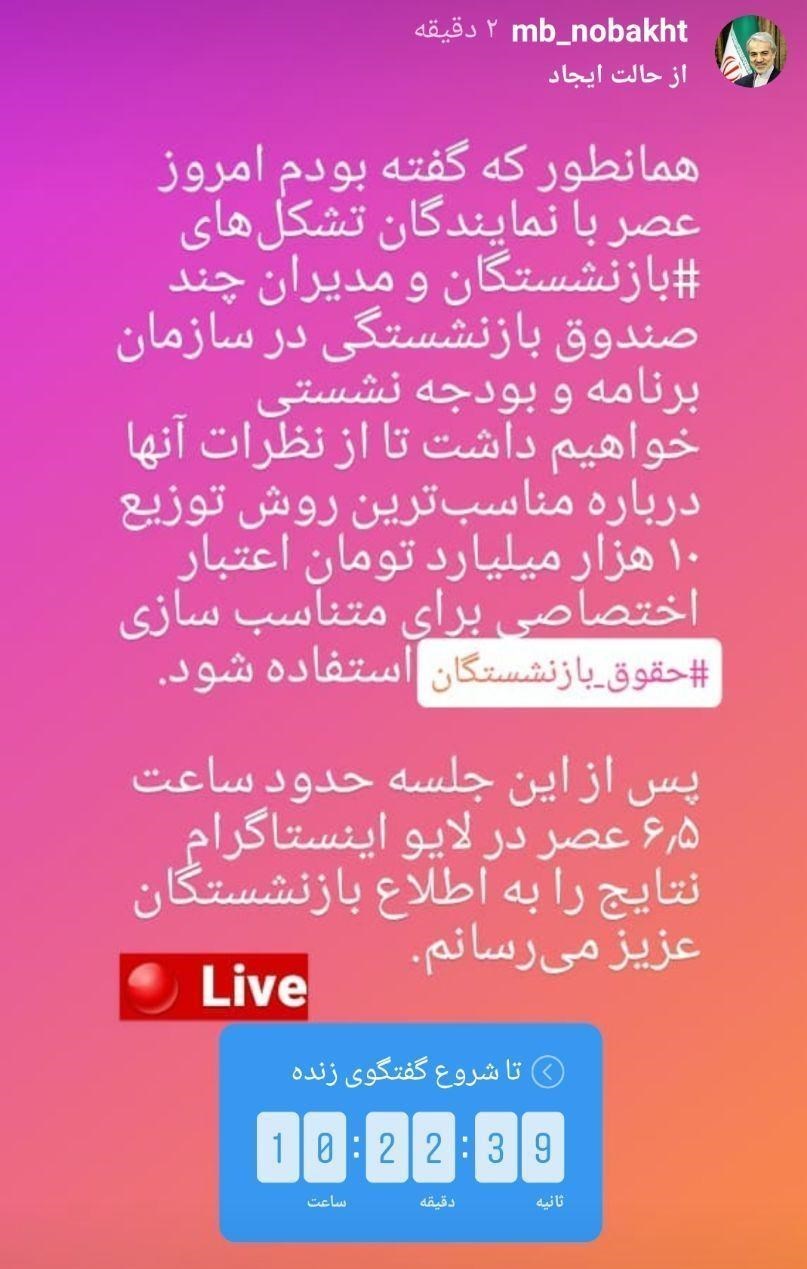 به گزارش خبرگزاری تسنیم، محمدباقر نوبخت رییس سازمان برنامه و بودجه در صفحه خود در اینستاگرام نوشت: «همان‌طور که گفته بودم امروز عصر با نمایندگان تشکل‌های بازنشستگان و مدیران چند صندوق بازنشستگی در سازمان برنامه و بودجه نشستی خواهیم داشت تا از نظرات آنها درباره مناسب‌ترین روش توزیع 10 هزار میلیارد تومان اعتبار اختصاصی برای متناسب‌سازی حقوق بازنشستگان استفاده شود. پس از این جلسه حدود ساعت 6٫5 عصر در لایو اینستاگرام نتایج را به اطلاع بازنشستگان عزیز می‌رسانم.»