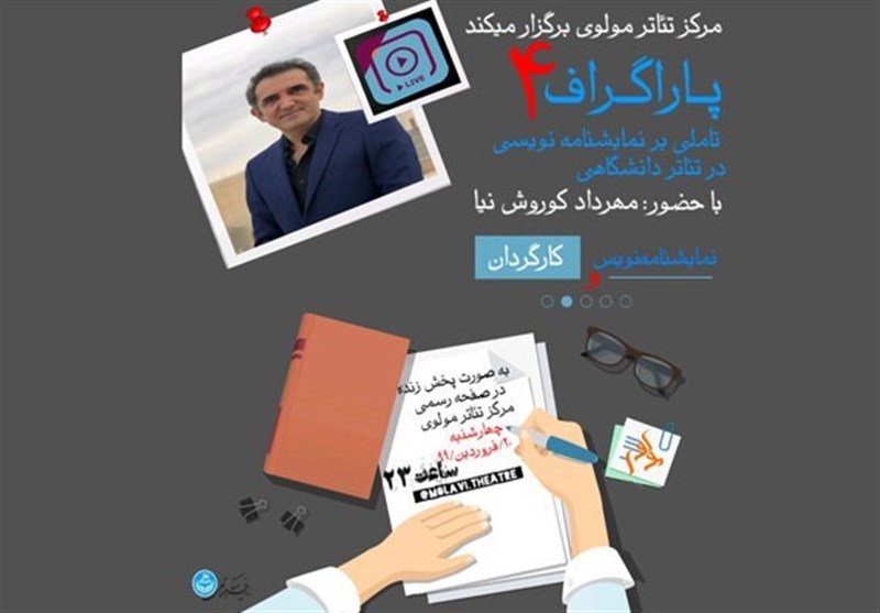 به گزارش خبرنگار فرهنگی باشگاه خبرنگاران پویا، در ادامه برگزاری نشستهای تخصصی مرکز تئاتر مولوی، چهارمین جلسه برنامه «پاراگراف» با عنوان «تأملی بر نمایشنامهنویسی در تئاتر دانشگاهی» به صورت پرسش و پاسخ آنلاین با حضور مهرداد کوروش نیا نویسنده نمایشنامههای «آخرین نامه»، «قرار»، «آقا لیلا» و ...، روز چهارشنبه 20 فروردین ساعت 23 در صفحه رسمی اینستاگرام مرکز تئاتر مولوی برگزار میشود.