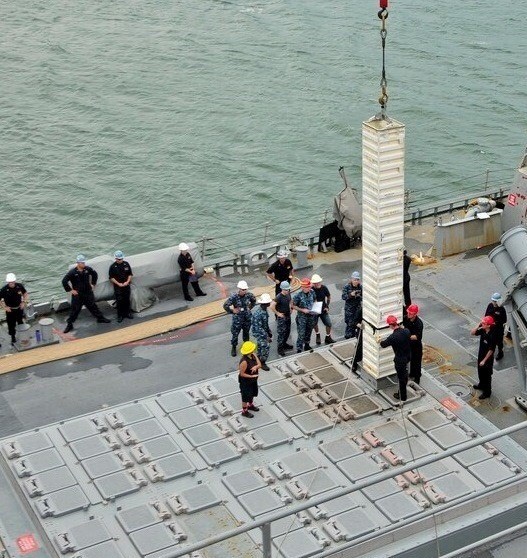 یک سیلوی پرتاب عمودی موشک پدافند هوایی برد بلند خارجی در حال جای‌دهی در ناو
