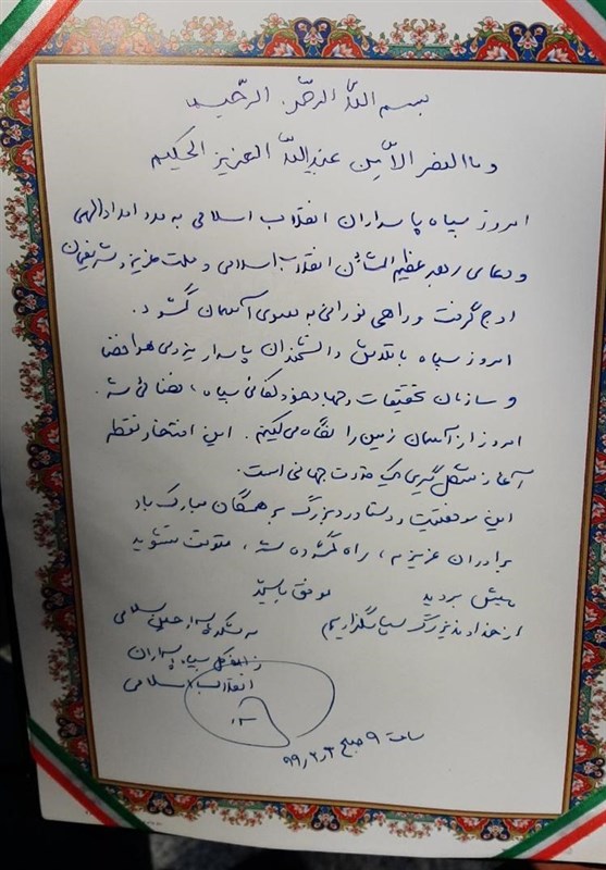 امروز سپاه  با تلاش دانشمندان پاسدار نیروی هوافضا و سازمان تحقیقات و جهاد خودکفایی سپاه فضایی شد. امروز از آسمان زمین را نگاه میکنیم. این اتفاق آغاز شکلگیری یک قدرت جهانی است.