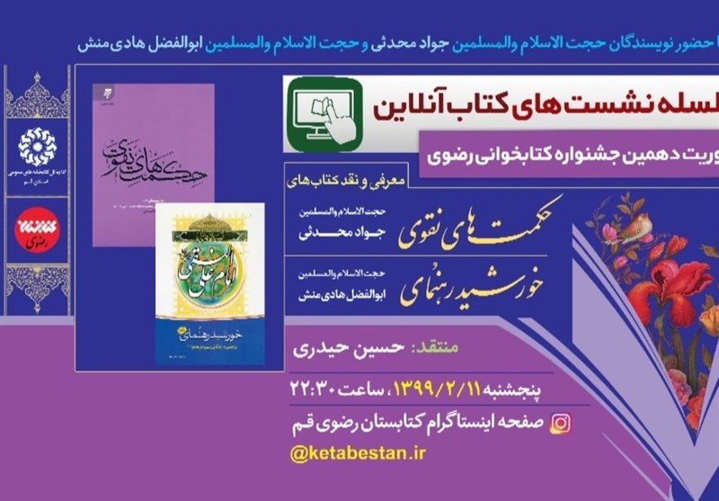وی بیان کرد: این نشست که با نام امام هادی(ع) و امام رضا (ع) مزین شده در نخستین شب جمعه ماه مبارک رمضان با حضور حجج اسلام جواد محدثی و ابوالفضل هادی منش و دیگر کاربران فعال در فضای مجازی برگزار می شود.
