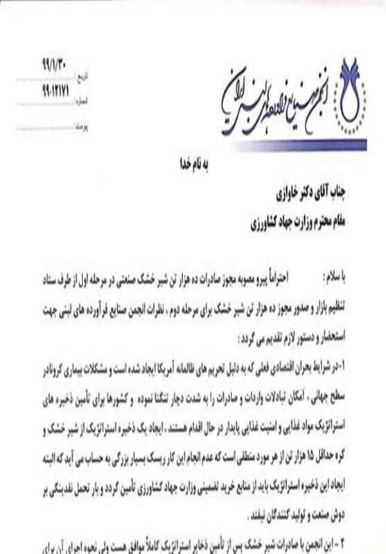 به گزارش خبرنگار اقتصادی خبرگزاری تسنیم رضا باکری دبیر انجمن صنایع لبنی با ارسال نامه ای به کاظم خاوازی وزیر وزارت جهاد کشاورزی نوشت: پیرو مصوبه مجوز صادرات دههزار تن شیرخشک صنعتی در مرحله اول از طرف ستاد تنظیم بازار و صدور مجوز دههزار تن شیرخشک برای مرحله دوم، نظرات انجمن صنایع فرآوردههای لبنی جهت استحضار و دستور لازم تقدیم میگردد: