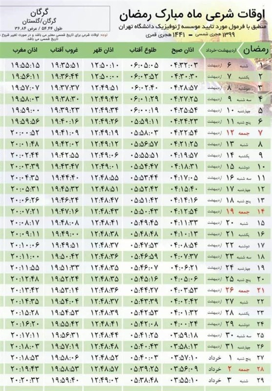 اوقات شرعی به افق گرگان در استان گلستان به شرح جدول ذیل است: