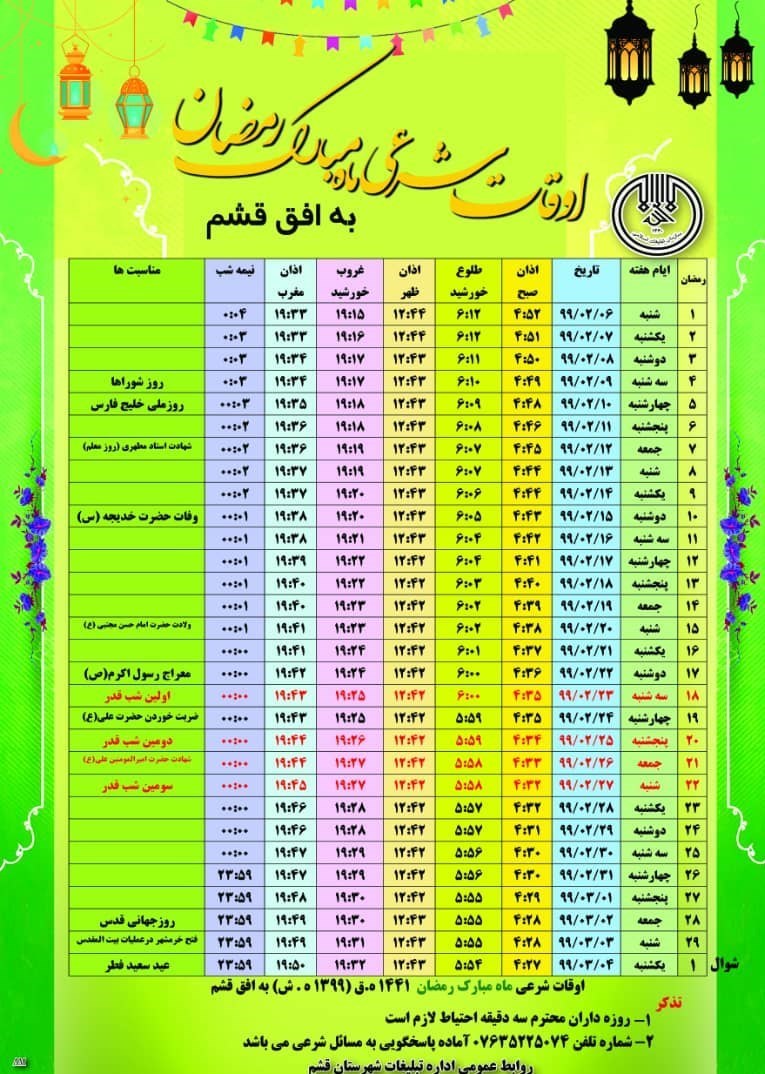 خبرگزاری تسنیم بهمنظور تسهیل دسترسی روزهداران به اوقات شرعی ماه مبارک رمضان جزیره قشم، جدول اوقات شرعی این جزیره را منتشر کرد.
