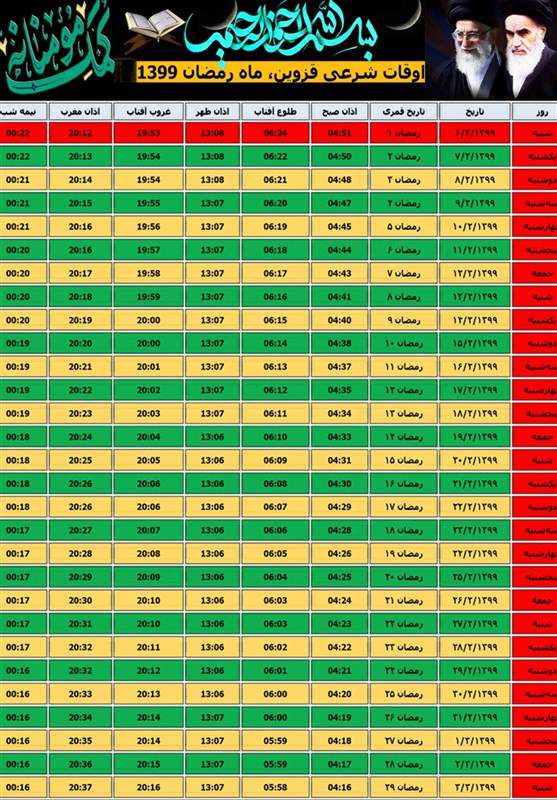 جدول اوقات شرعی شهرستان قزوین نیز در این ماه مبارک به صورت زیر است: