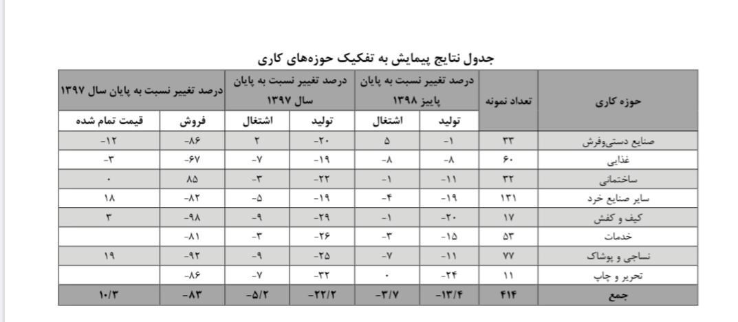 براساس این گزارش میزان تولید در واحدهای صنفی تولیدی خدماتی نسبت به فصل گذشته (آخر پاییز 1398) به طور متوسط 13.4 درصد نسبت به پایان سال 97 کاهش داشته است.