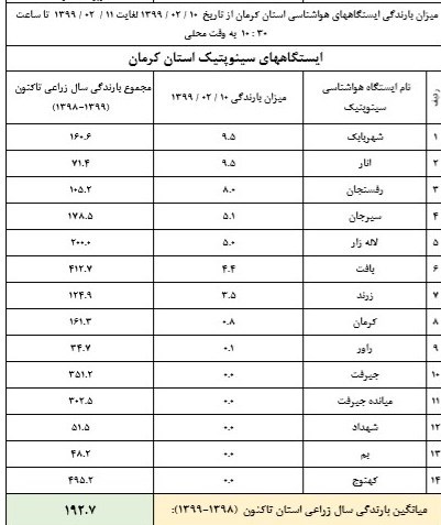 وی با بیان اینکه تا ساعت 10 و 30 دقیقه صبح امروز میانگین بارندگی سال زراعی 99-98 در استان کرمان به 192.7 میلیمتر رسیده است گفت: تداوم فعالیت سامانه بارشی در سطح استان کرمان تا فردا ادامه داد و شدت بارش در شمال و غرب استان بیشتر از سایر مناطق پیشبینی میشود.