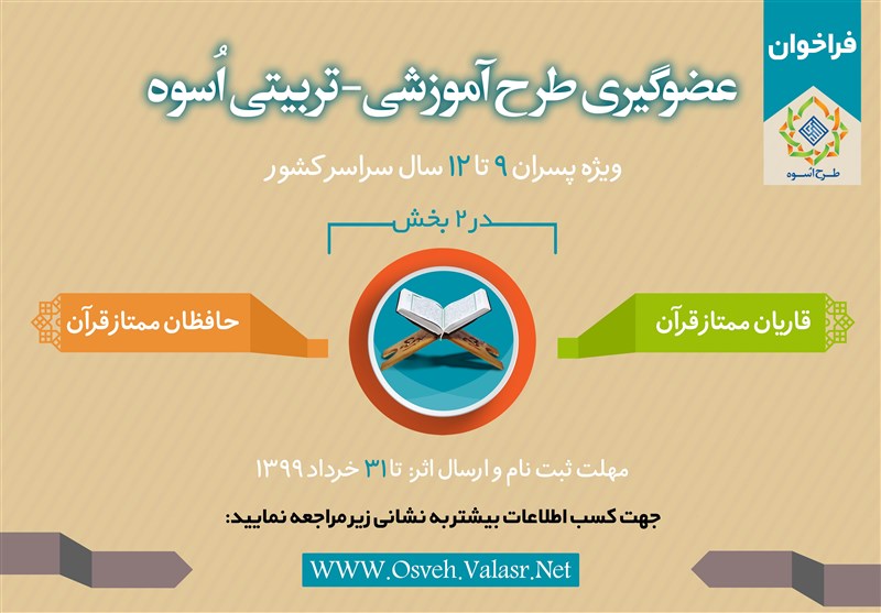معاون اجرایی شورای عالی قرآن از آغاز ثبتنام دوره سیزدهم این طرح خبرداد و گفت: ثبتنام تا پایان خرداد ادامه دارد و قاریان و حافظان زیر 12 سال میتوانند با مراجعه به پایگاه اطلاعرسانی اُسوه ضمن مطالعه شرایط و ضوابط طرح، اثر خود را ارسال کنند. آثار دریافت شده توسط اساتید ارزیابی میشود و شرکتکنندگان میتوانند پس از طی مراحلی به عضویت آزمایشی درآیند و در صورت احراز توانمندی و کسب تواناییهای لازم به عضویت ثابت و رسمی پذیرفته میشوند.