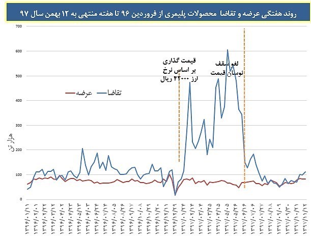 نمودار1 کاهش تقاضا در اثر عرضه مواد پتروشیمی در بورس کالا بدون سقف قیمت: