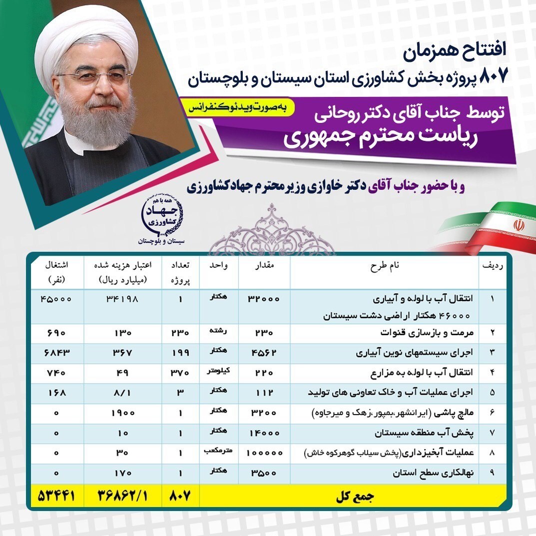 رئیس جمهور با تاکید بر اینکه با پیگیری وزیر جهاد کشاورزی و استاندار سیستان و بلوچستان همه طرح های مکمل این طرح اجرایی و عملیاتی شود، گفت: محصولاتی که با اجرای این طرح در اختیار مردم منطقه و کشور قرار می گیرد بسیار ارزشمند است.