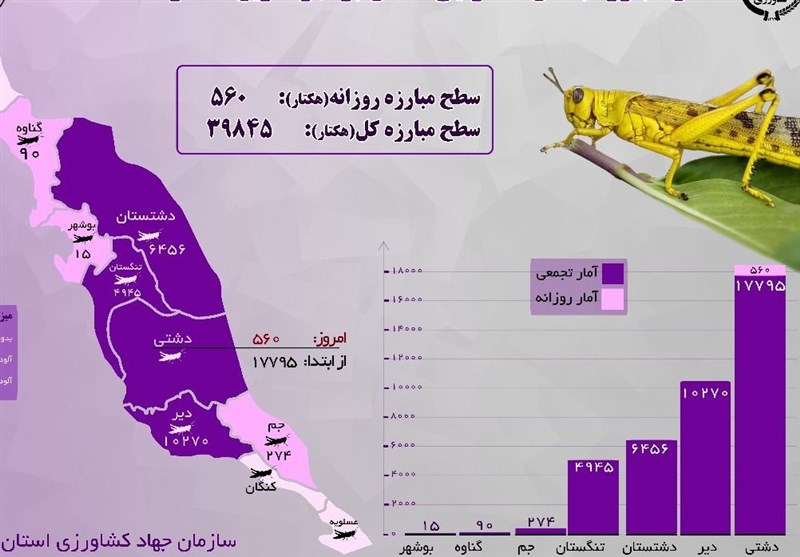 براساس اعلام رئیس سازمان جهاد کشاورزی استان بوشهر پیش بینی میشود بیش از 200 هزار هکتار اراضی استان بوشهر آلوده به آفت ملخ صحرایی شود که در این راستا از همان ابتدای هجوم ملخها اقدمات مبارزه با ملخ در دشتها و اراضی ملی، منابع طبیعی و کشاورزی آغاز شد.