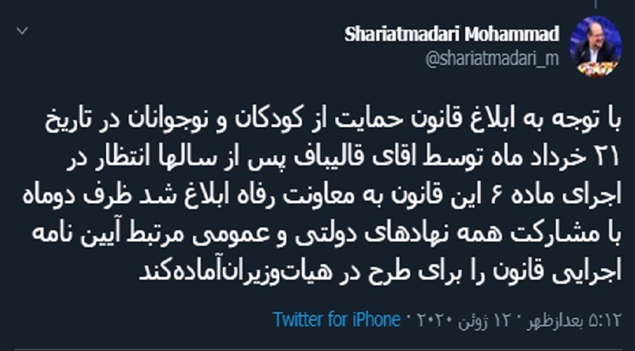 به گزارش گروه اجتماعی خبرگزاری تسنیم، محمد شریعتمداری وزیر تعاون، کار و رفاه اجتماعی در صفحه شخصی خود نوشت: با توجه به ابلاغ قانون حمایت از کودکان و نوجوانان در تاریخ 21 خرداد ماه توسط آقای قالیباف پس از سالها انتظار در اجرای ماده 6 این قانون به معاونت رفاه ابلاغ شدتا ظرف دوماه با مشارکت همه نهادهای دولتی و عمومی مرتبط، آیین نامه اجرایی قانون را برای طرح در هیئتوزیران آمادهکند.
