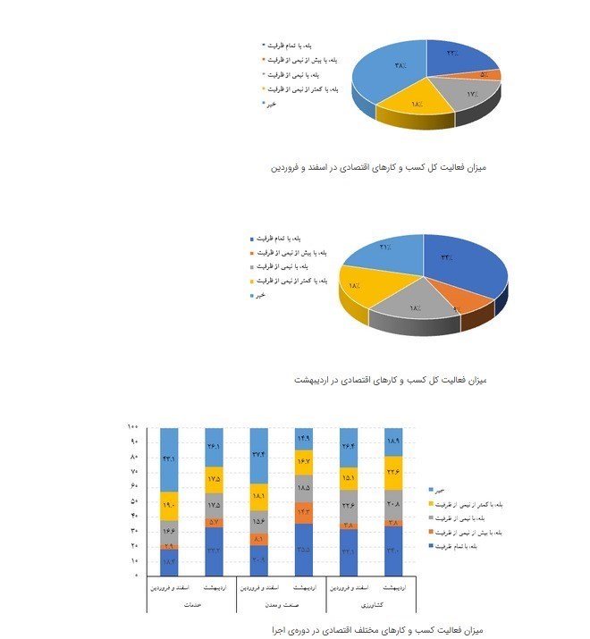 بر اساس بررسی های انجام شده روی میزان فعالیت کل کسب و کارهای اقتصادی در زمان شیوع کرونا، در حالیکه 38 درصد کسب و کارها بر اثر کرونا در اسفند و فروردین فعالیتی نداشته‌اند این مقدار در اردیبهشت به 21 درصد رسیده است.