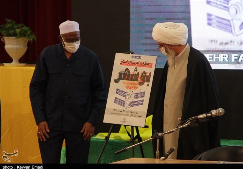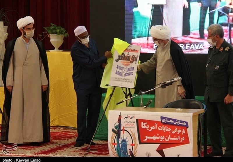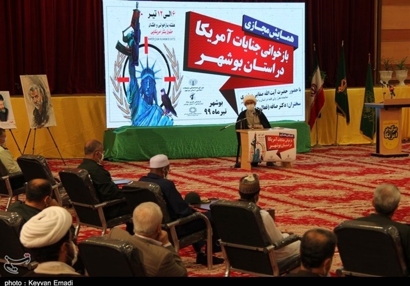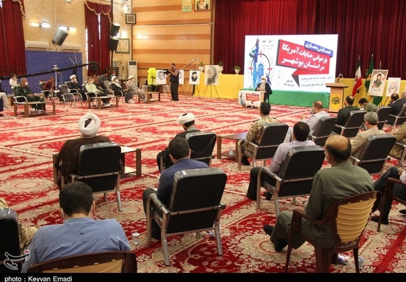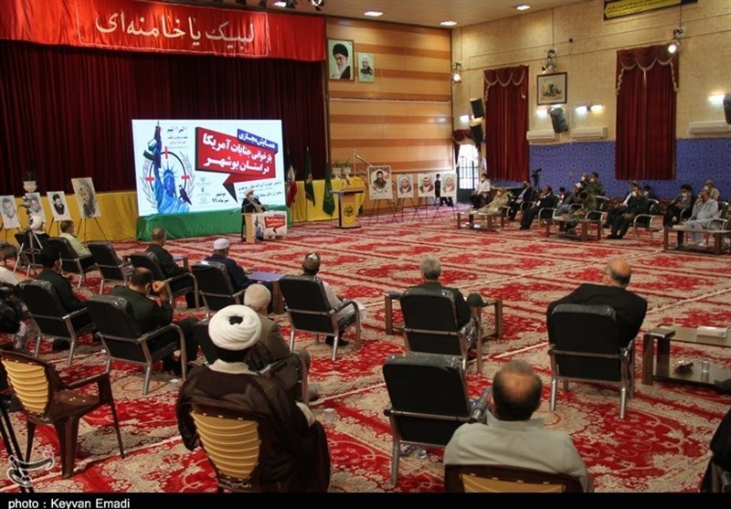 در این همایش که به صورت زنده از شبکه‌های اجتماعی و سیمای مرکز بوشهر پخش می‌شد فرمانده سپاه امام صادق(ع) استان بوشهر با بیان اینکه آمریکایی‌ها از ابتدای پیروزی انقلاب اسلامی، جنایت  خود را علیه جمهوری اسلامی ایران آغاز کردند اظهار داشت:  حمایت از تجزیه طلبان، اعمال فشارها و تحریم‌ها، حمایت از رژیم بعث عراق در جنگ تحمیلی، ایجاد کودتاهای مختلف، بمباران مراکز نظامی و اقتصادی و حمله به سکوهای نفتی و شناورهای نظامی و اقتصادی، به شهادت رساندن مسافران هواپیمای مسافربری، ایجاد اغتشاشات، جلوگیری از دسترسی مردم ایران به فناوری‌های جدید از جمله فناوری صلح آمیز هسته‌ای برخی از این جنایت‌ها و تجاوزها به حقوق جمهوری اسلامی ایران است.