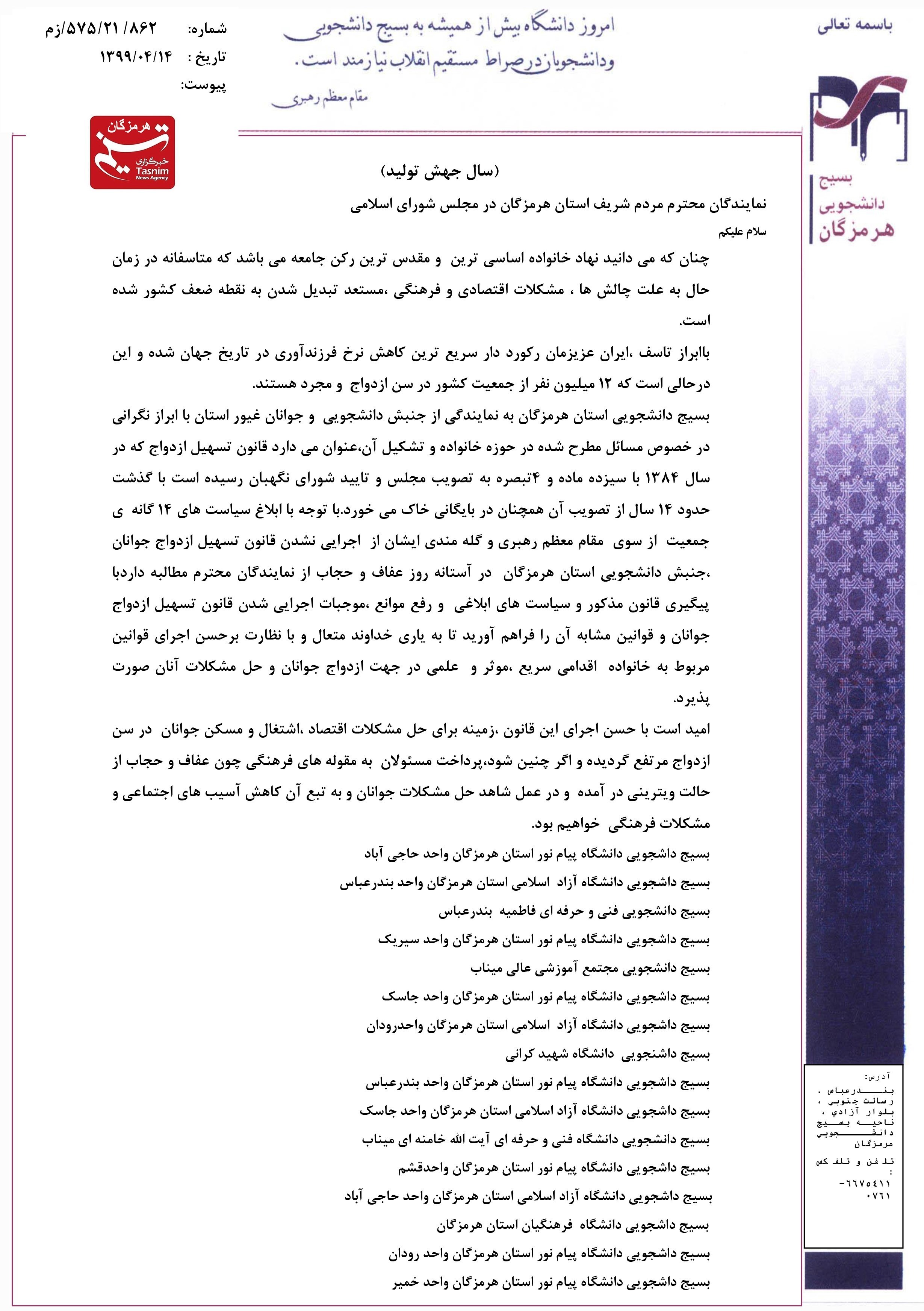 بسیج دانشجویی استان هرمزگان به نمایندگی از جنبش دانشجویی و جوانان غیور استان با ابراز نگرانی در خصوص مسائل مطرح شده در حوزه خانواده و تشکیل آن، عنوان میدارد قانون تسهیل ازدواج که در سال 1384 با سیزده ماده و 4 تبصره به تصویب مجلس و تایید شورای نگهبان رسیده است با گذشت حدود 14 سال از تصویب آن همچنان در بایگانی خاک میخورد. با توجه با ابلاغ سیاستهای 14 گانه جمعیت از سوی مقام معظم رهبری و گله مندی ایشان از اجرایی نشدن قانون تسهیل ازدواج جوانان، جنبش دانشجویی استان هرمزگان در آستانه روز عفاف و حجاب از نمایندگان محترم مطالبه دارد با پیگیری قانون مذکور و سیاستهای ابلاغی و رفع موانع، موجبات اجرایی شدن قانون تسهیل ازدواج جوانان و قوانین مشابه آن را فراهم آورید تا به یاری خداوند متعال و با نظارت برحسن اجرای قوانین مربوط به خانواده اقدامی سریع، موثر و علمی در جهت ازدواج جوانان و حل مشکالت آنان صورت پذیرد.