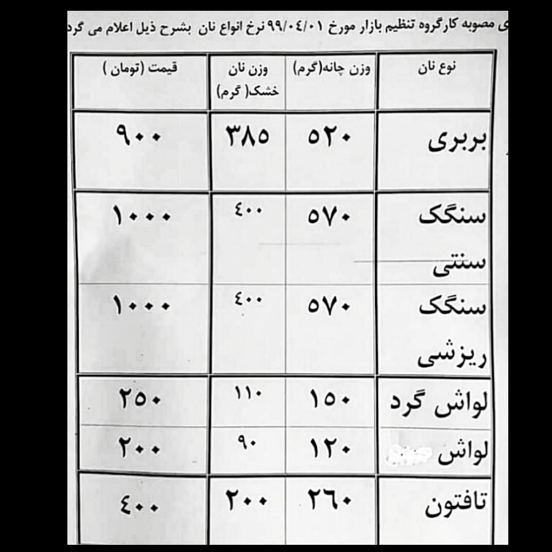 در جدول زیر قیمت جدید انواع نان در استان گیلان آمده است: