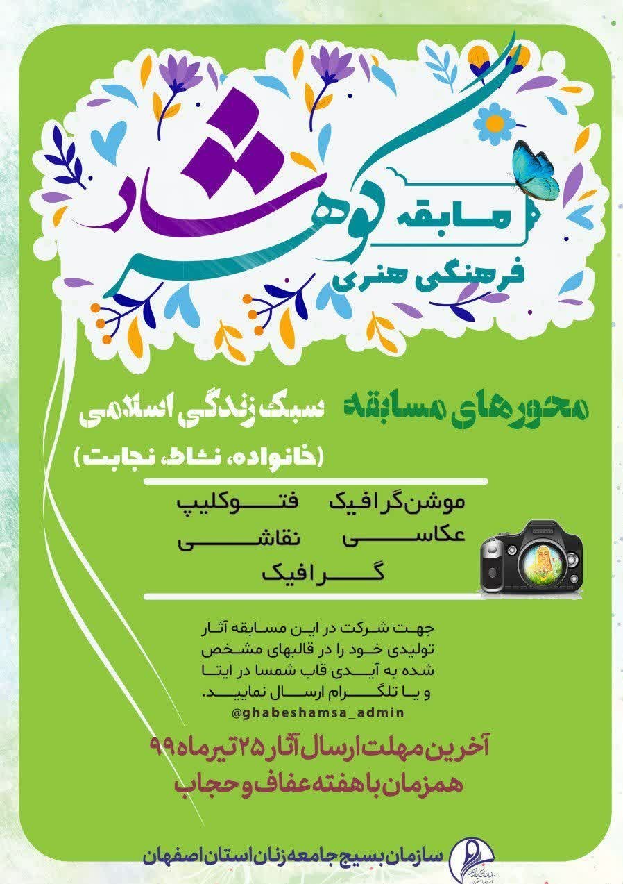 برای شرکت در مسابقه گوهرشاد که به همت سازمان بسیج جامعه زنان استان اصفهان برگزار میشود، شرکت کنندگان میتوانند آثار تولیدی خود را به آیدی قاب شمسا در ایتا و تلگرام ارسال کنند.