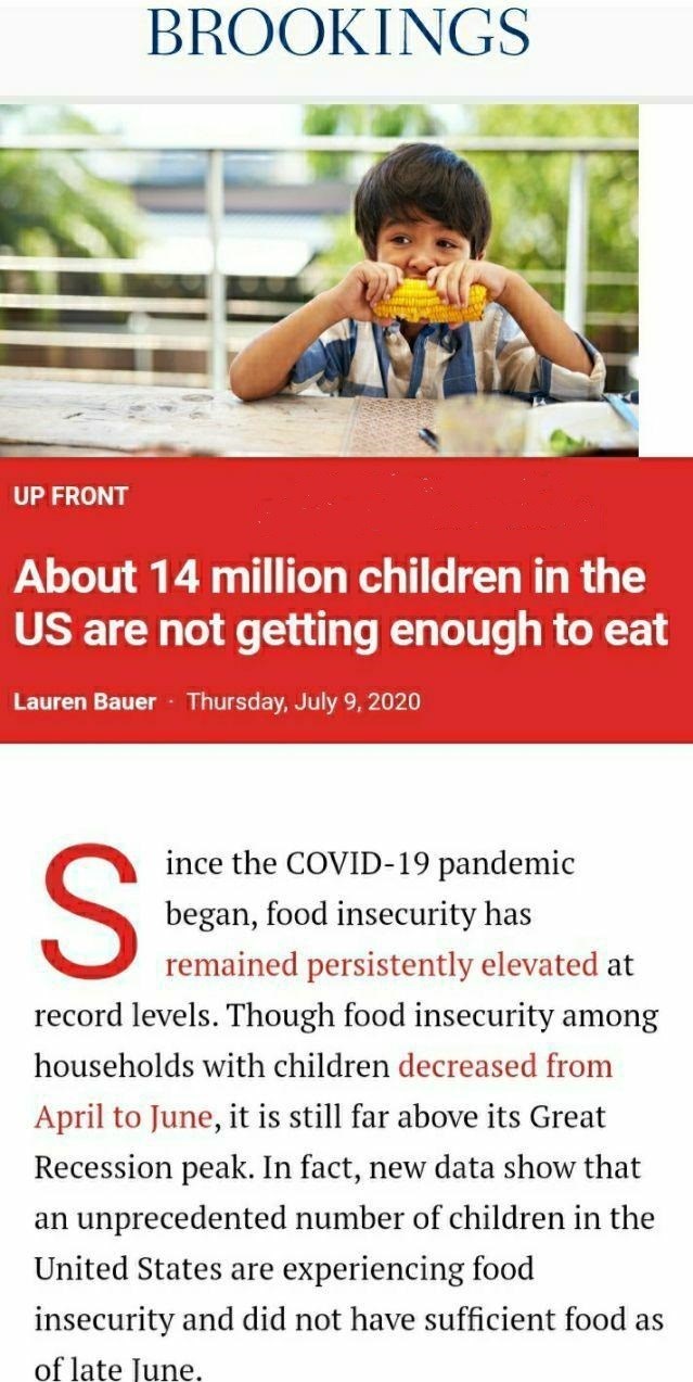 به این ترتیب که "در 7 روز گذشته کودکانی (زیر 18 سال) که در خانه شما زندگی میکنند آیا اغلب، گاهی اوقات یا هرگز غذای کافی دارند!؟"، 16.5 درصد از خانوارهای دارای کودک گزارش دادهاند که در هفته 18 تا 23 ژوئن 2020 گاهی اوقات یا غالباً اتفاق میافتد که کودکان بهدلیل کمبود منابع، بهاندازه کافی غذا نمیخورند! این آمار 5.5 برابر نرخ سال 2018 آمریکاست.