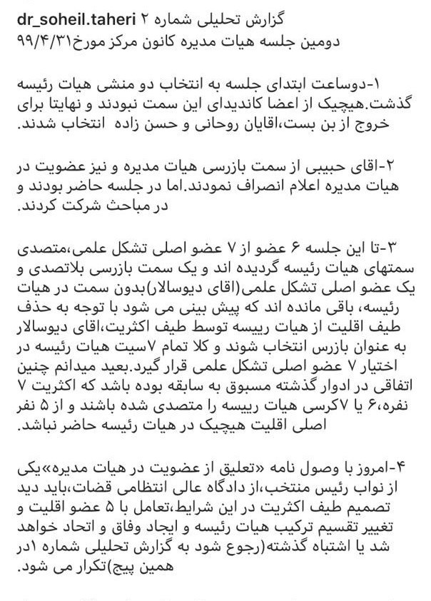 به گزارش خبرنگار قضایی خبرگزاری تسنیم؛ سهیل طاهری یکی از اعضای هیئت مدیره کانون وکلا در صفحه شخصی خود در اینستاگرام با اعلام این خبر نوشت: "امروز (31 تیر 99) با وصول نامه «تعلیق از عضویت در هیئت مدیره» یکی از نواب رئیس منتخب از دادگاه عالی انتظامی قضات، باید دید تصمیم طیف اکثریت هیئت مدیره در این شرایط، تعامل با پنج عضو اقلیت و تغییر ترکیب هیئت رئیسه کانون و ایجاد وفاق و اتحاد خواهد بود یا اشتباه گذشته خود را تکرار میکنند."