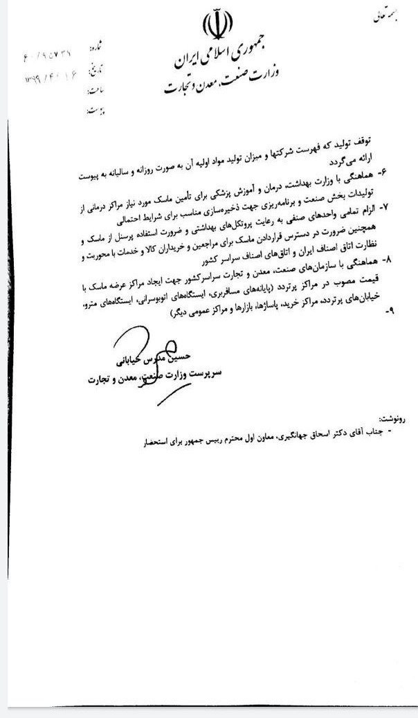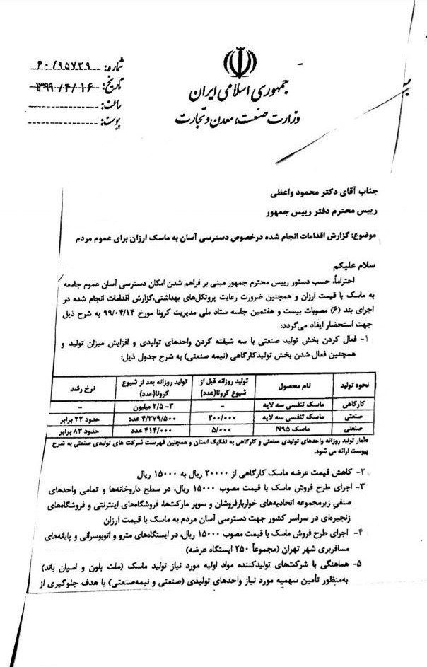 در همین راستا نامهای از سوی مدرس خیابانی به رپیس جمهور و هیات دولت ارسال شده است که در آن رشد تولید ماسک های سه لایه کارگاهی را 22 برابر و با تولید روزانه 200 هزار ماسک اعلام کرده است.