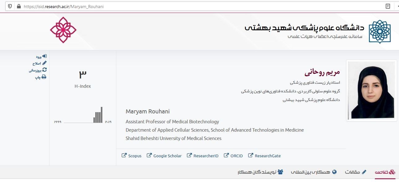 مخاطبان گرامی می‌توانند با مراجعه به آدرس https://isid.research.ac.ir/Maryam_Rouhani از جزییات اطلاعات درج‌شده برای خانم مریم روحانی در این سامانه مطلع شوند. در این سامانه نیز خانم مریم روحانی به‌عنوان «استادیار» دانشگاه علوم پزشکی شهید بهشتی معرفی شده است!