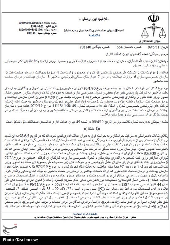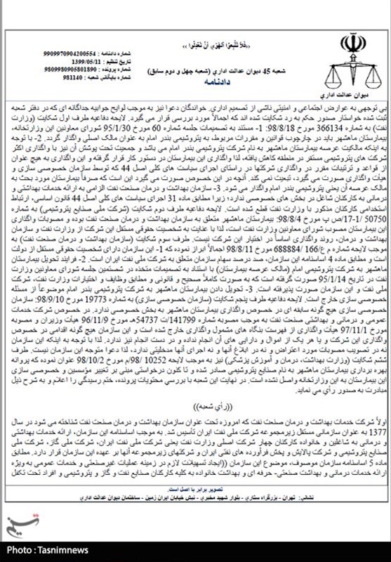 دیوان عدالت اداری در رای خود آورده است که تصمیم اتخاذ شده برای واگذاری بیمارستان صنایع پتروشیمی بدون توجه به عواقب حقوقی و آزادی مشروع شهروندان بوده و این موضوع موجب اثرات اقتصادی، اجتماعی، سیاسی و امنیتی در منطقه شده است.