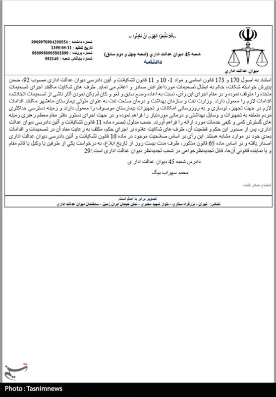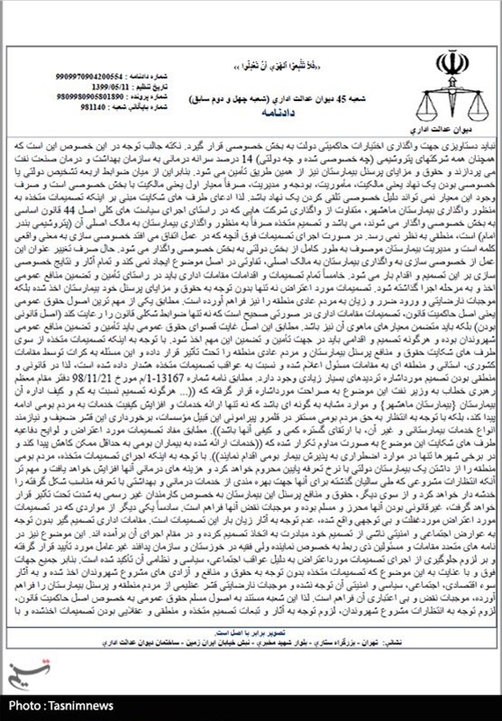 در انتهای این حکم آمده است که ابطال رای وزیر نفت و عدم واگذاری این بیمارستان به بخش خصوصی در راستای ارائه خدمات کمی و کیفی و گسترش آن ها در میان مردم بوده است.