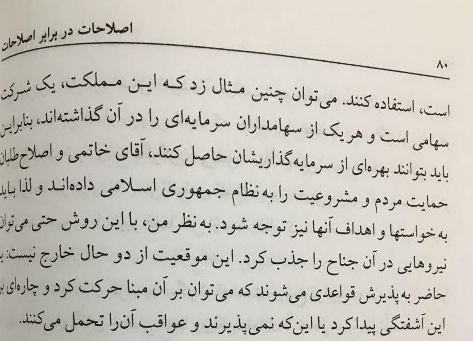 جناب حجاریان در این باره نسبت به مورد اول تصریح بسیار بیشتر و روشنتری دارد. او میگوید که "قائلان به پروژه اصلاحات باید تلاش کنند ضمن آنکه پایی در میان مردم دارند، پایی درون قدرت باز کنند. اگر نتوانستند، لااقل بر بخشهایی از بلوک قدرت تأثیر بگذارند؛ بخشهایی از قدرت که به دورنمای منافع ملی وفادارتر هستند و حاضرند صدای اصلی اصلاحطلبان را در سطوح بالا –که تصمیمسازی در آن اتفاق میافتد- رِله کنند."
