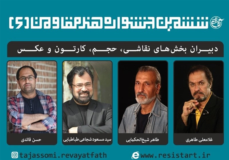 ششمین جشنواره جهانی هنر مقاومت در هشت بخش «نقاشی» ، «کارتون» ، «حجم» ،«عکس» ، «پرچم و کتیبه» ، «تایپوگرافی» ، «تصویرسازی» ، «عکس» توسط گروه هنرهای تجسمی بنیاد فرهنگی روایت فتح ، بهمن ماه سال جاری در تهران برگزار خواهد شد.