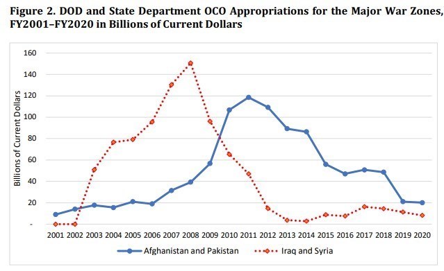 نمودار زیر هزینههای مربوط به افغانستان، پاکستان، سوریه و عراق را بهصورت سالانه نشان میدهد. خط آبی در این نمودار مربوط به افغانستان و پاکستان و خط نقطهچین قرمز مربوط به عراق و سوریه است.