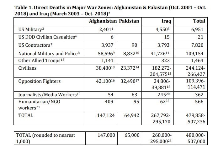 در این میان، حدود 7 هزار نیروی نظامی آمریکایی در مناطق جنگی در افغانستان، عراق و پاکستان کشته شدهاند. نزدیک به 8 هزار پیمانکار آمریکایی دیگر نیز کشته شدهاند، تعداد دیگری هم بر اثر جراحات جنگی بعدها جان باختهاند، صدها هزار نفر هم زخمی شدهاند.