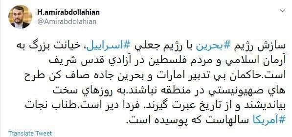 به گزارش گروه بین الملل خبرگزاری تسنیم، امیرعبداللهیان دستیار ویژه رئیس مجلس شورای اسلامی ایران در واکنش به عادی سازی روابط بحرین با رژیم صهیونیستی در توئیتی نوشت: سازش رژیم بحرین با رژیم جعلی اسرائیل خیانت بزرگ به آرمان اسلامی و مردم فلسطین در آزادی قدس شریف است.