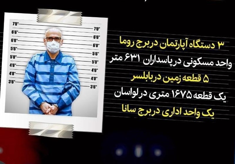 از جمله این املاک میتوان به 3 دستگاه آپارتمان در برج روما، یک واحد مسکونی در پاسداران به مساحت 631 متر، 5 قطعه زمین در بابلسر، یک قطعه 1675 متری در لواسان، یک واحد اداری در برج سانا، زمین 300 متری در خیابان کریمخان و ... اشاره کرد.
