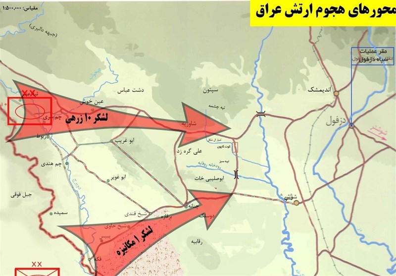 در این محور، لشکر 10 زرهی تحت امر سپاه سوم ارتش عراق، ماموریت داشت از محور عملیاتی علی غربی- پل رمیله برروی رودخانه طیب حمرین- روبوط- رودخانه میمه موسیان- عینخوش و دشت عباس با 13 گردان مانوری که دارای 280 دستگاه تانک و 90 عراده توپ صحرایی پشتیبانی میشد وارد عمل شده با رساندن خود به پل نادری از رودخانه کرخه عبور کرده و با قطع راه ارتباطی اهواز ـ تهران، پایگاه هوایی دزفول را به تصرف درآورده و شهرهای اندیمشک و دزفول را اشغال کند. خط حد این یگان از پاسگاه سمیده تا چیلات بود در این محور ، تیپ 2 زرهی دزفول به فرماندهی سرهنگ امرالله شهبازی آرایش گرفته بود.