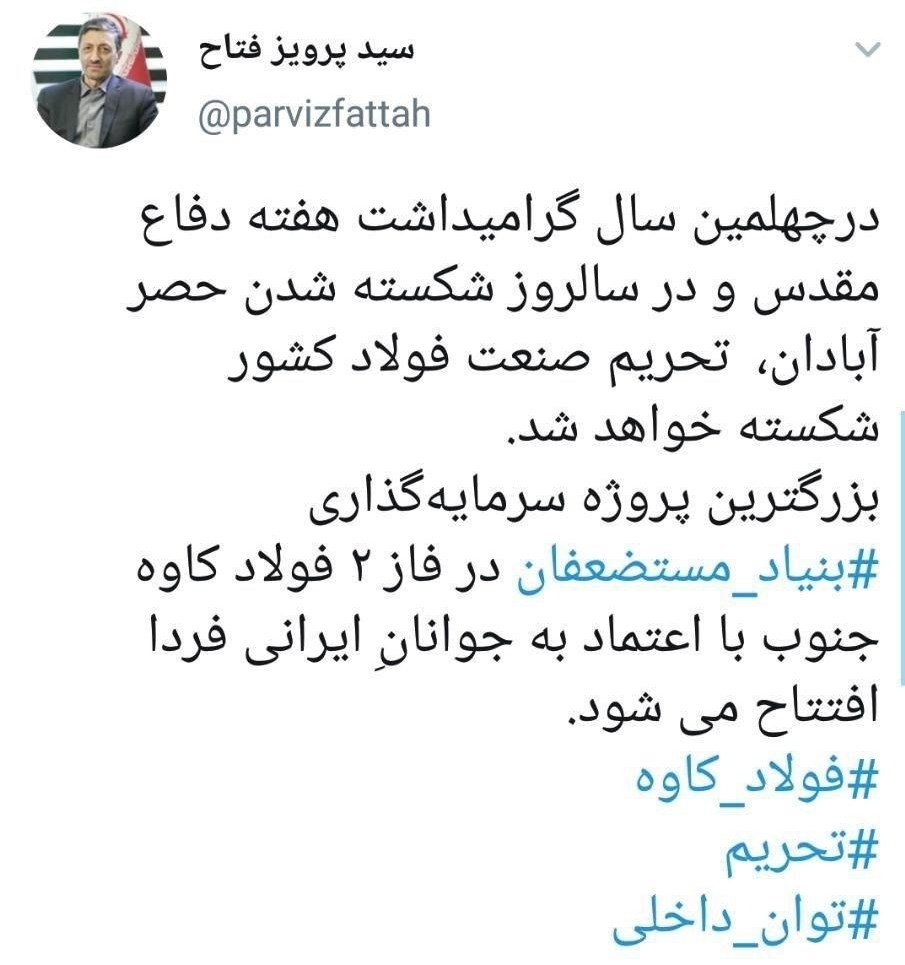 در چهلمین سال گرامیداشت هفته دفاع مقدس و در سالروز شکسته شدن حصر آبادان، تحریم صنعت فولاد کشور شکسته خواهد شد.