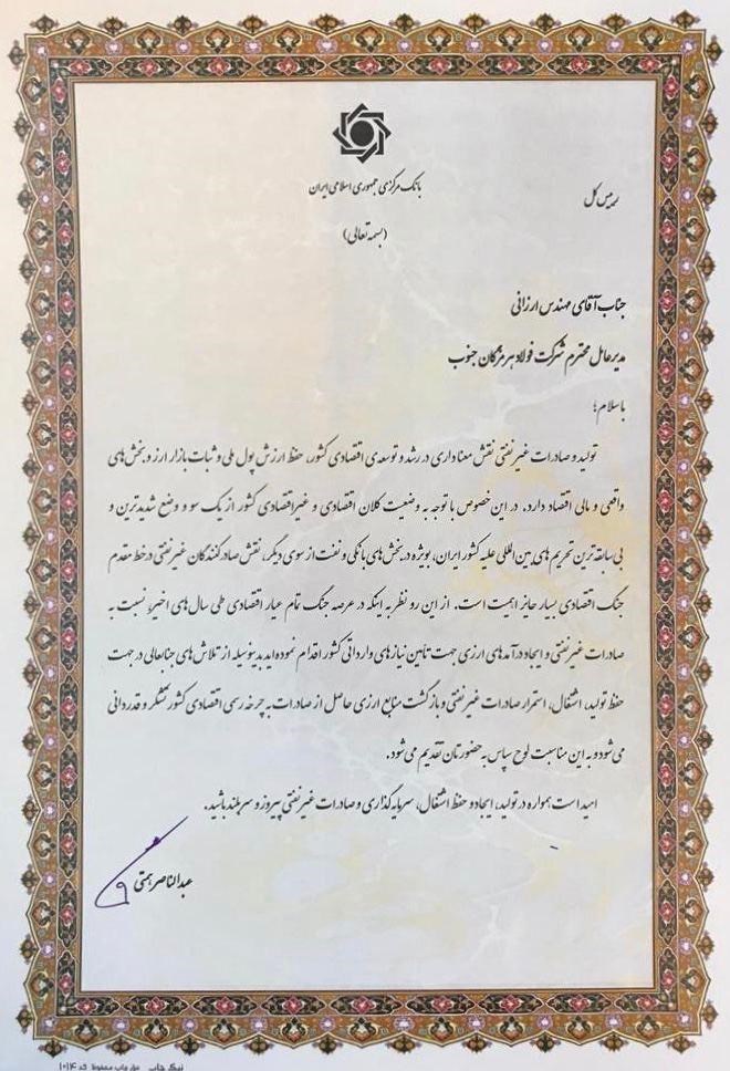 ازاین رو نظر بر اینکه در عرصه جنگ تمام عیار اقتصادی طی سالهای اخیر نسبت به صادرات غیر نفتی و ایجاد درآمدهای ارزی جهت تامین نیازهای وارداتی کشور اقدام نموده اید بدین وسیله از تلاشهای جنابعالی در جهت حفظ تولید اشتغال استمرار صادرات غیر نفتی و بازگشت منابع ارزی حاصل از صادرات در چرخه رسمی اقتصاد کشور تشکر و قدردانی می شود و به این مناسبت لوح سپاس به حضورتان تقدیم می شود.