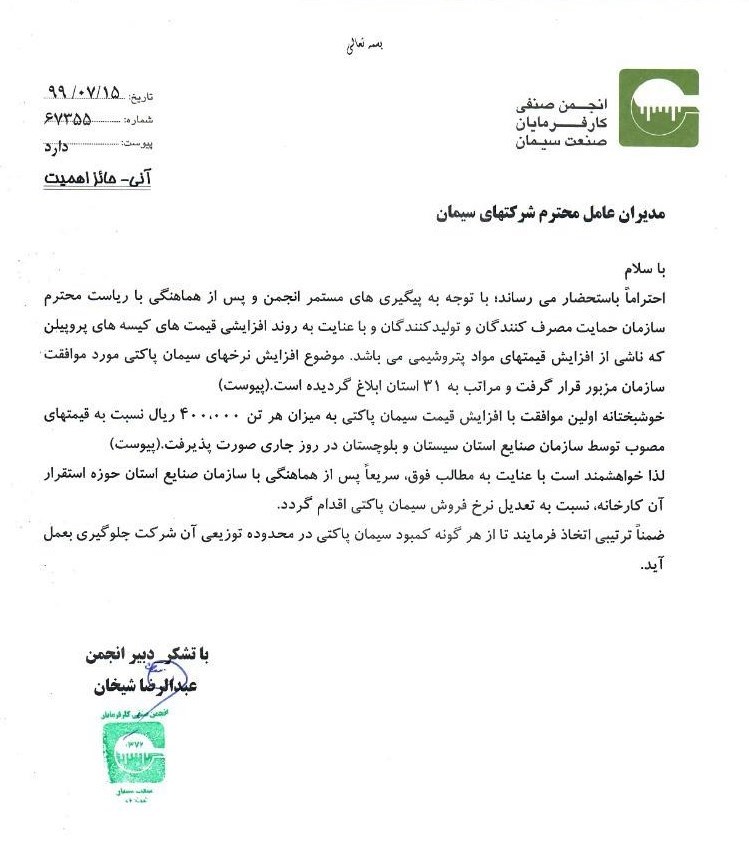 پیگیریهای مستمر انجمن صنفی کارفرمایان صنعت سیمان و پس از هماهنگی با رییس سازمان حمایت مصرفکنندگان و تولیدکنندگان، باتوجه به افزایش قیمت کیسههای پروپیلن که ناشی از افزایش قیمت مواد پتروشیمی بوده است، سازمان مذبور (سازمان حمایت مصرفکنندگان و تولیدکنندگان) با افزایش نرخ سیمان پاکتی موافقت کرده مراتب را به 31 استان ابلاغ کرده است.