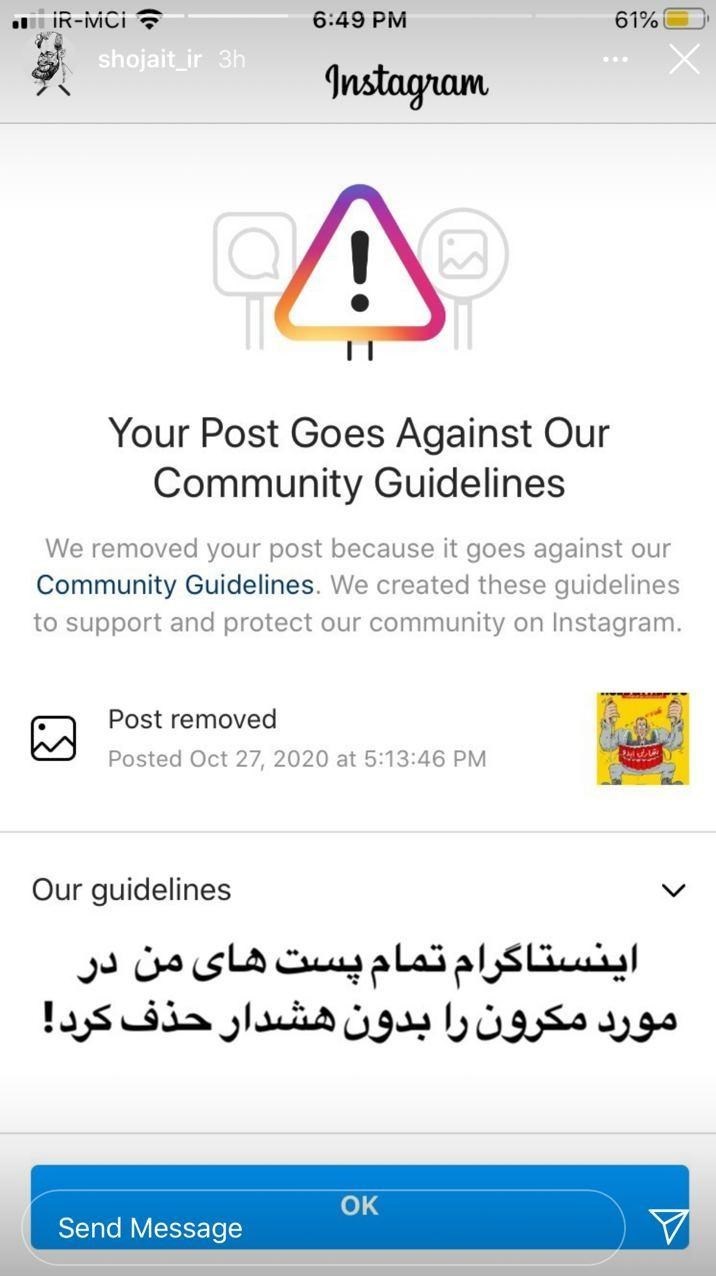 مسعود شجاعی طباطبایی کاریکاتوریست معروف کشورمان اعلام کرده اینستاگرام تمام پستهای او درباره مکرون را بدون حتی هیچ هشداری حذف کرده است.