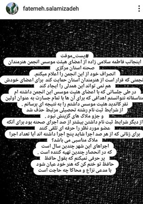 سلامیزاده در پستی که در صفحه شخصی اینستاگرام خود منتشر کرده آورده است: اینجانب فاطمه سلامیزاده از اعضای هیئت موسس انجمن هنرمندان صحنه استان مرکزی انصراف خود را اعلام میکنم.
